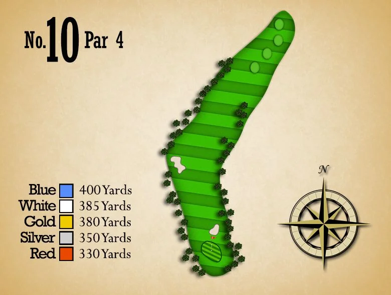A uphill Par 4 that has trouble left and out of bounds right. The green is very narrow and protected in the front and back with bunkers. Accurate distance is critical with your approach shot.
