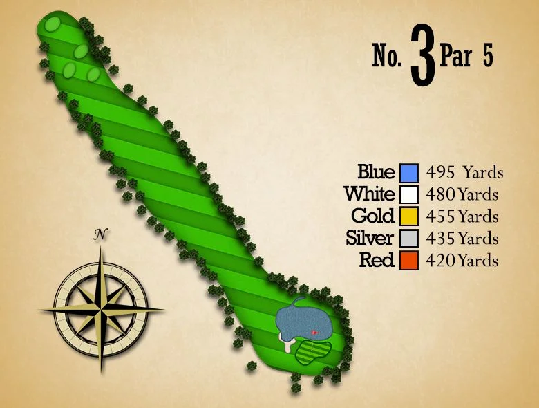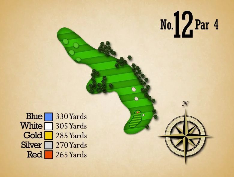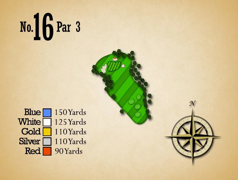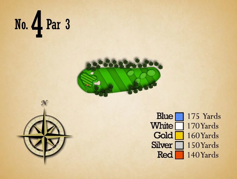An extremely short Par 3 that requires an exact yardage shot. This very, undulated green is guarded by a creek in front and bunkers left, right, and back. The correct club selection is critical.