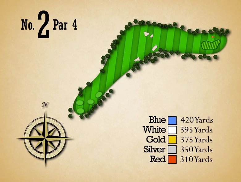 This straight forward Par 4 requires a straight, long drive off the tee. You approach is more uphill than you realize. Avoid the front, greenside bunker at all costs.